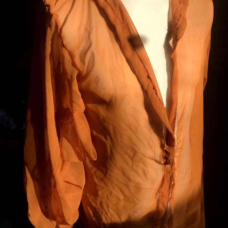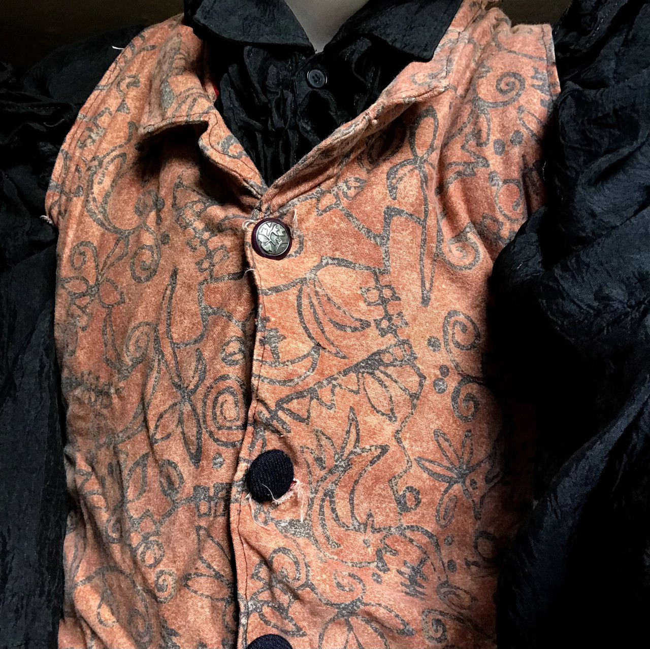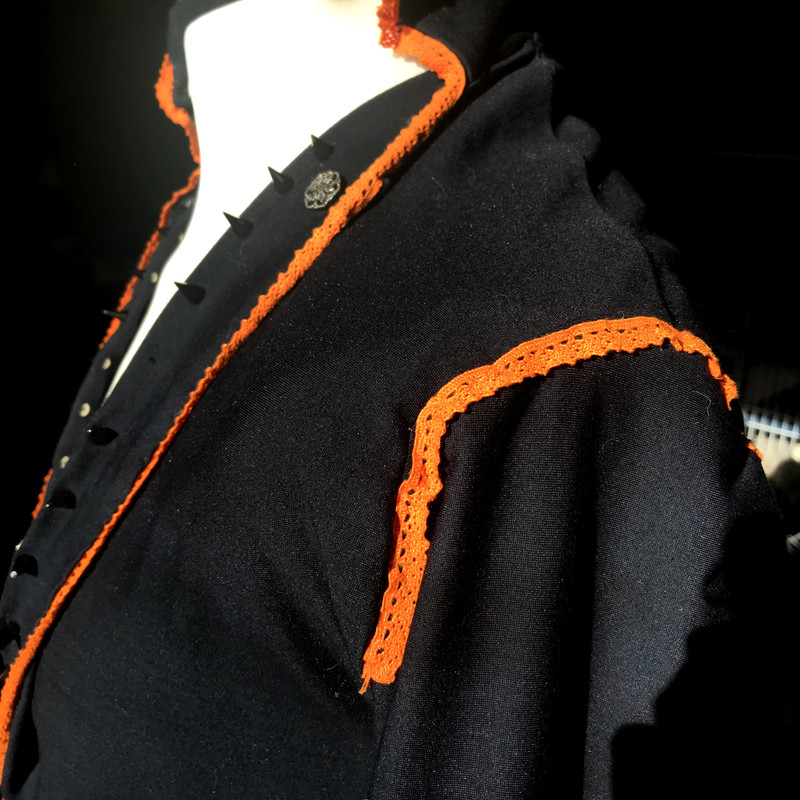 Long black jacket with orange lace and spikes along the lapels